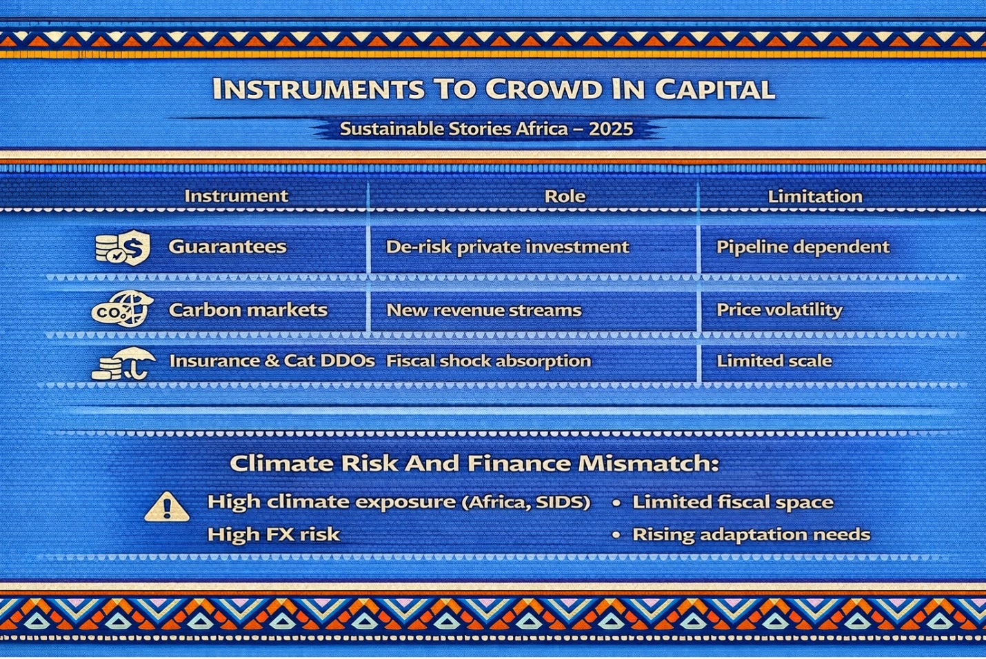 Most climate finance continues to flow through sovereign channels, increasing exposure to FX risk and debt sustainability pressures. For low‑income and climate‑vulnerable countries, particularly in Sub‑Saharan Africa, this creates a paradox: those least responsible for emissions carry the heaviest fiscal burden of climate response.