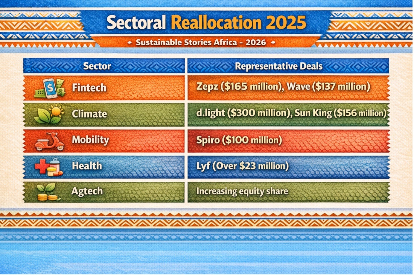 - Fintech: Zepz ($165M), Wave ($137M), Khokha ($93M), Moniepoint ($90M)