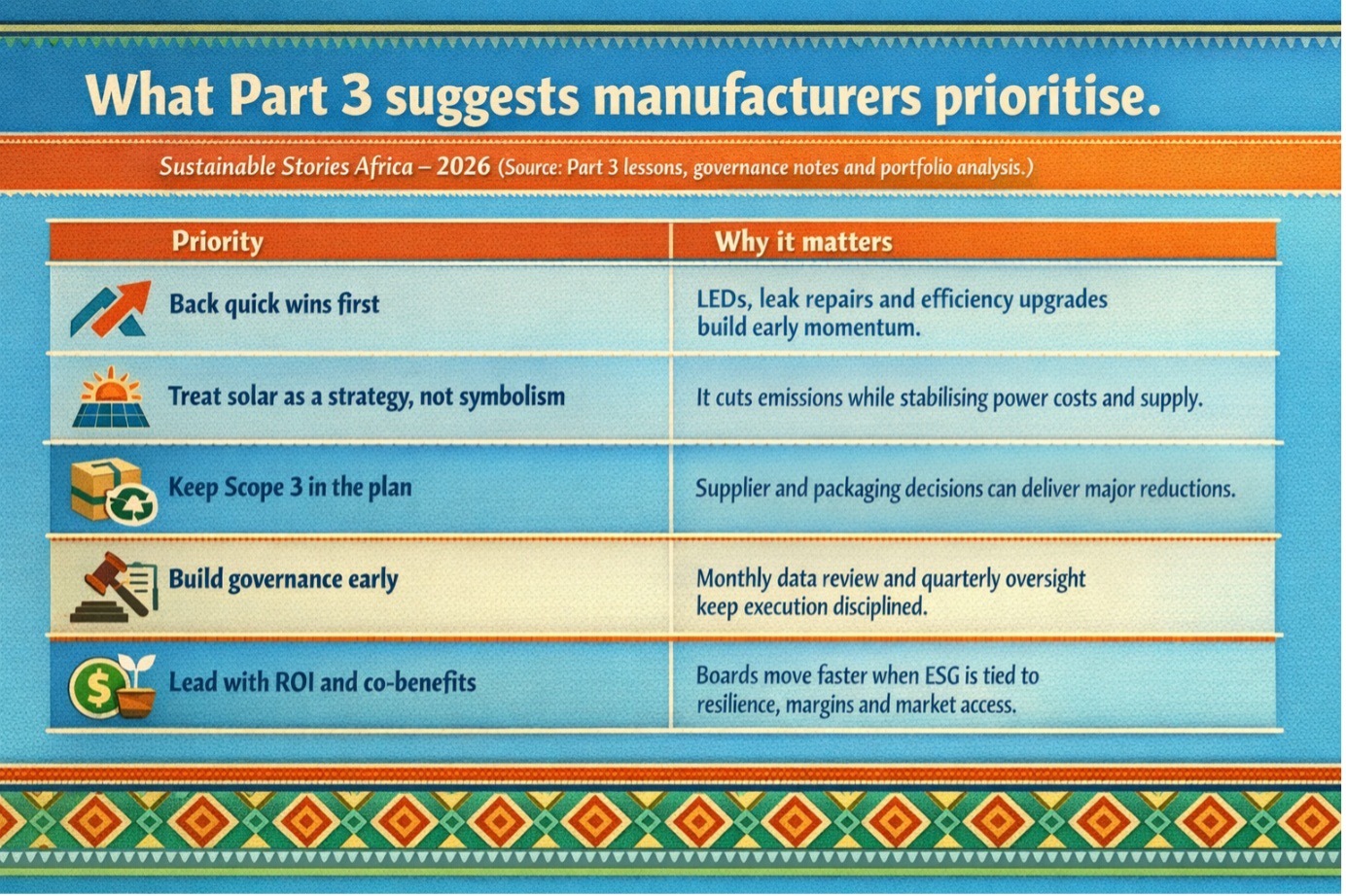 Part 3 leaves a clear conclusion: African manufacturers that move from baseline measurement to disciplined implementation will be better placed on cost, compliance, energy resilience and export credibility.