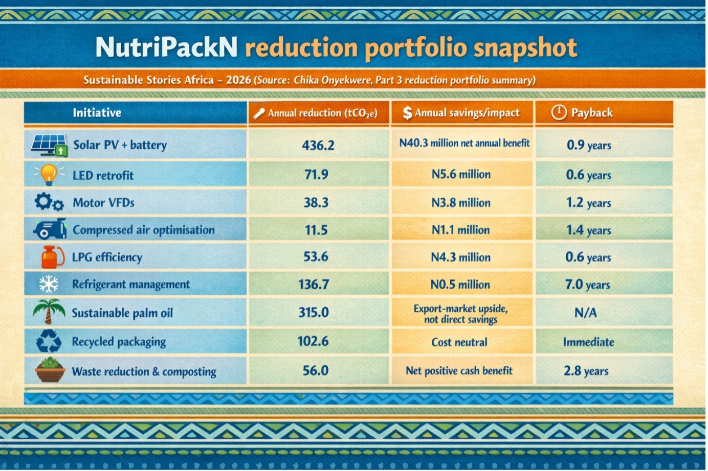 The anchor case remains NutriPackN Foods in Ogun State, Nigeria, first introduced in Part 2 with a baseline footprint of 4,847 tonnes CO₂e and a 30% reduction target by 2028.