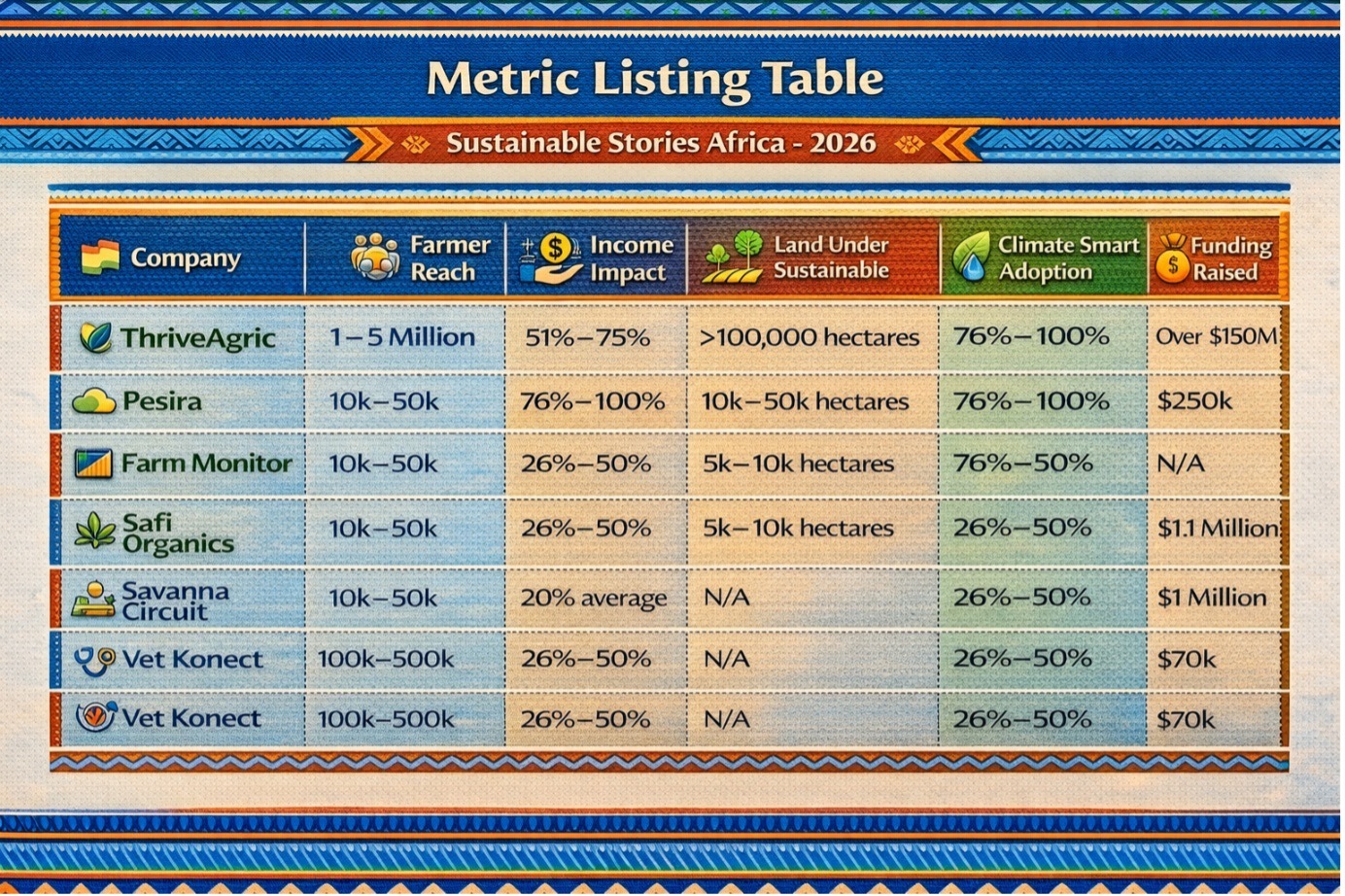 The catalogue documents ventures ranging from $70k raised (Vet Konect) to over $150M (ThriveAgric). Funding visibility correlates with structured reporting.