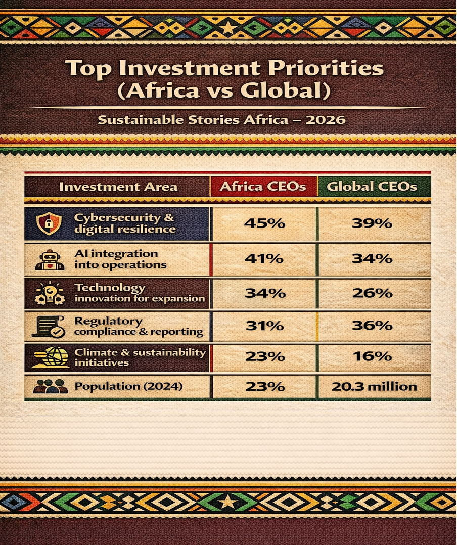 Infrastructure constraints, including unreliable power, limited broadband, and high computing costs, continue to slow adoption. However, 34% of African CEOs are investing in technology and solution innovation, exceeding global peers at 26%.