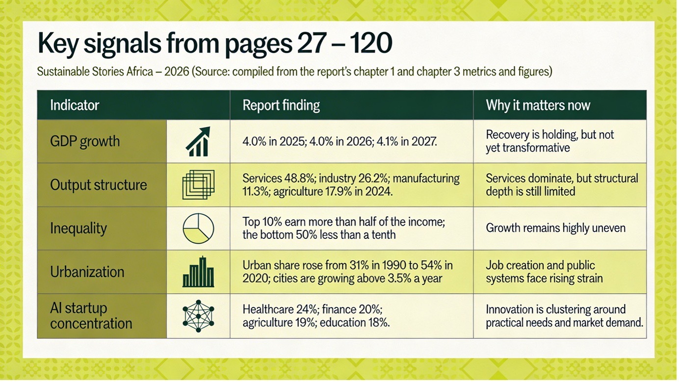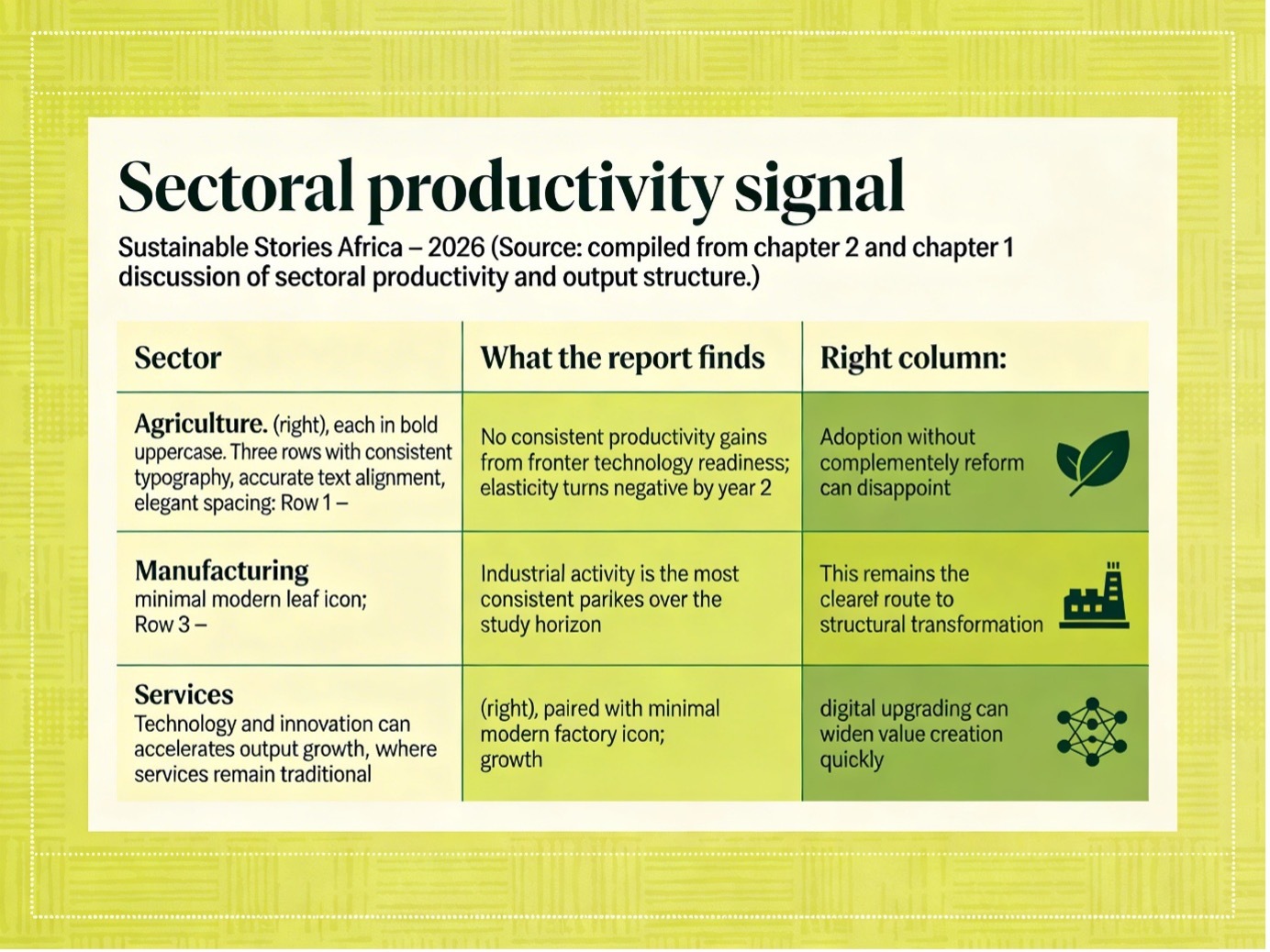 Across the selected pages, the report’s evidence points in one direction. Africa will not gain more from simply using more digital tools than from making those tools productive in manufacturing, smarter in services, and practical in agriculture, public administration, and energy systems.