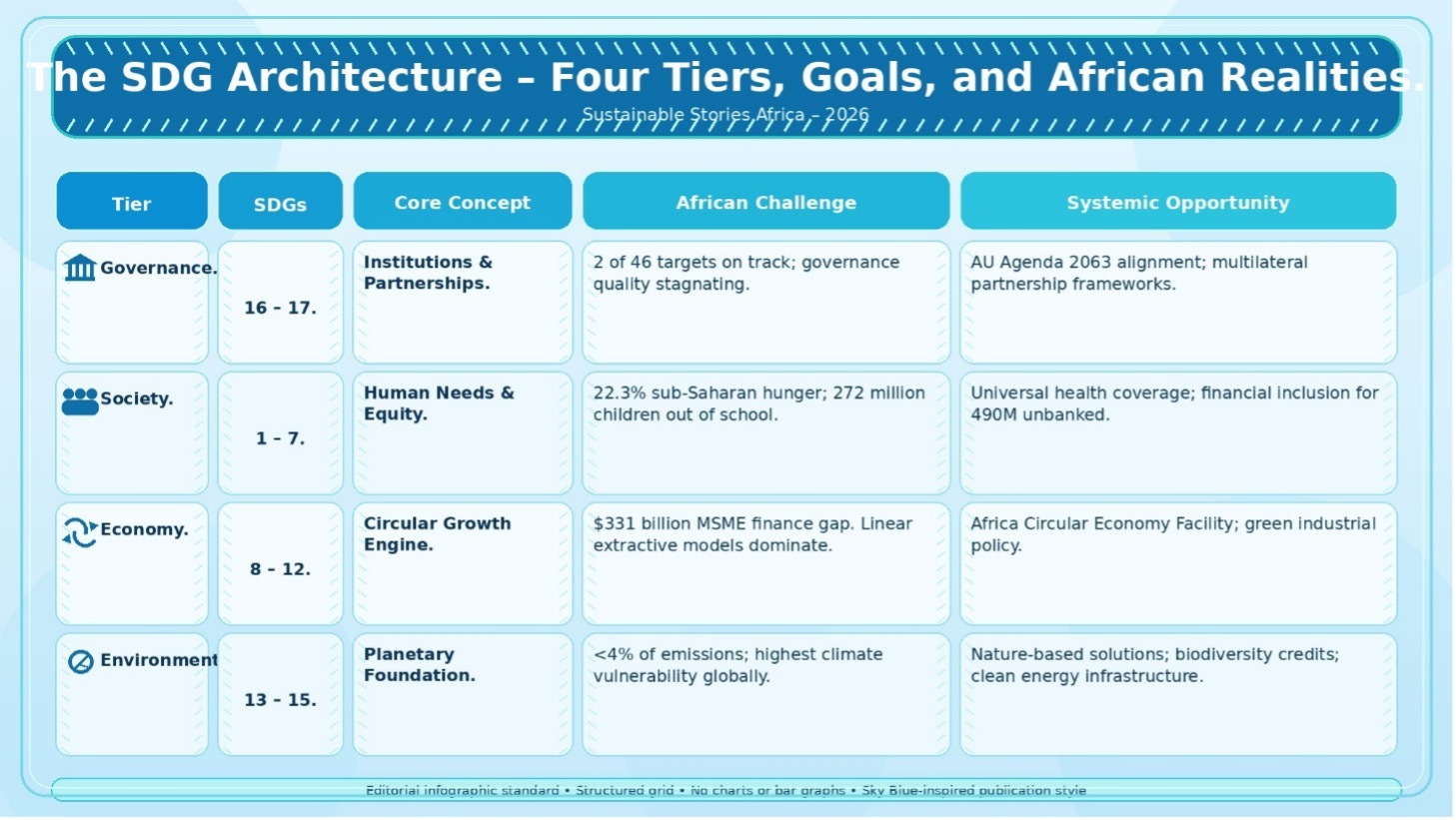 That is why a system-based visual framework matters. By grouping all 17 goals into four-tiered domains, it offers policymakers, ESG investors and development practitioners a clearer way to understand how the goals interact, and what a credible path to 2030 will require, especially for Africa.
