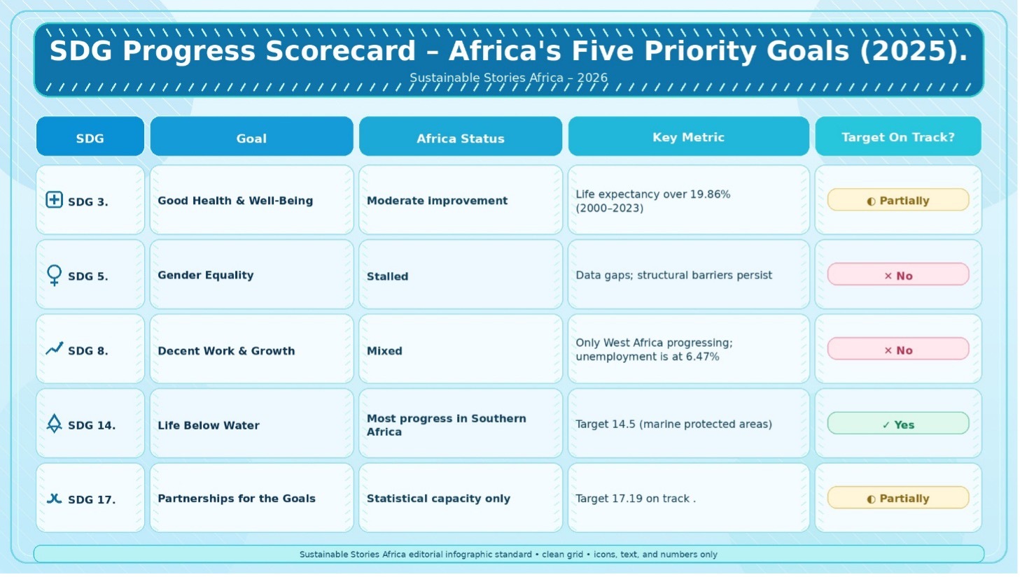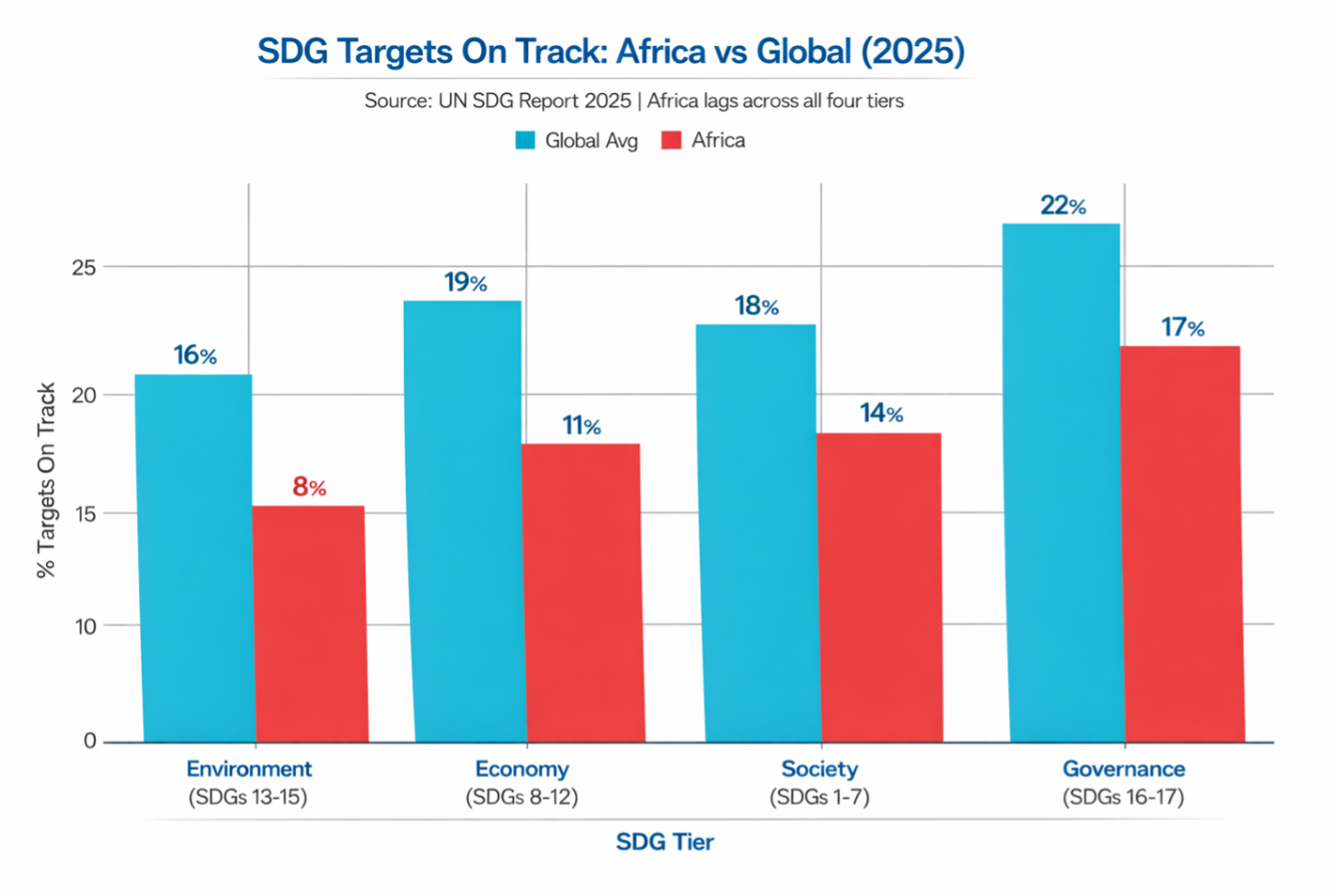 As of 2025, only 18% of SDG targets are on track globally; in Africa, progress has reversed on several critical indicators.