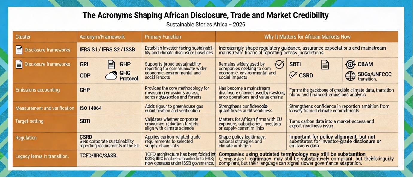 From IFRS and GRI to CBAM and SBTi, the question is no longer what the letters mean, but which ones now move capital, market access and corporate trust across Africa.