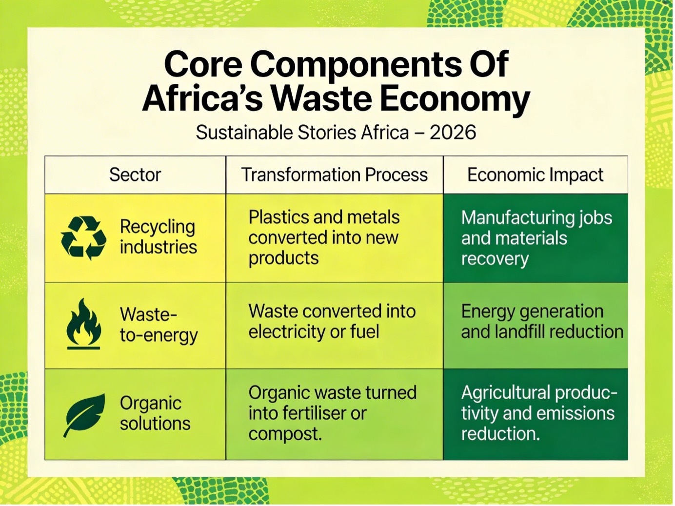 The linked infographic “The Waste Economy: Transforming Waste into Wealth in Africa” illustrates how waste can support new industries, including recycling, waste-to-energy technologies and organic fertiliser production.
