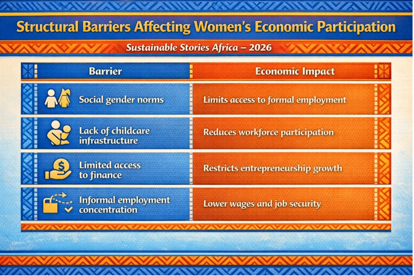 These norms often influence access to education, employment opportunities and entrepreneurial capital. Women are also more likely to work in informal sectors with lower wages and limited legal protections.