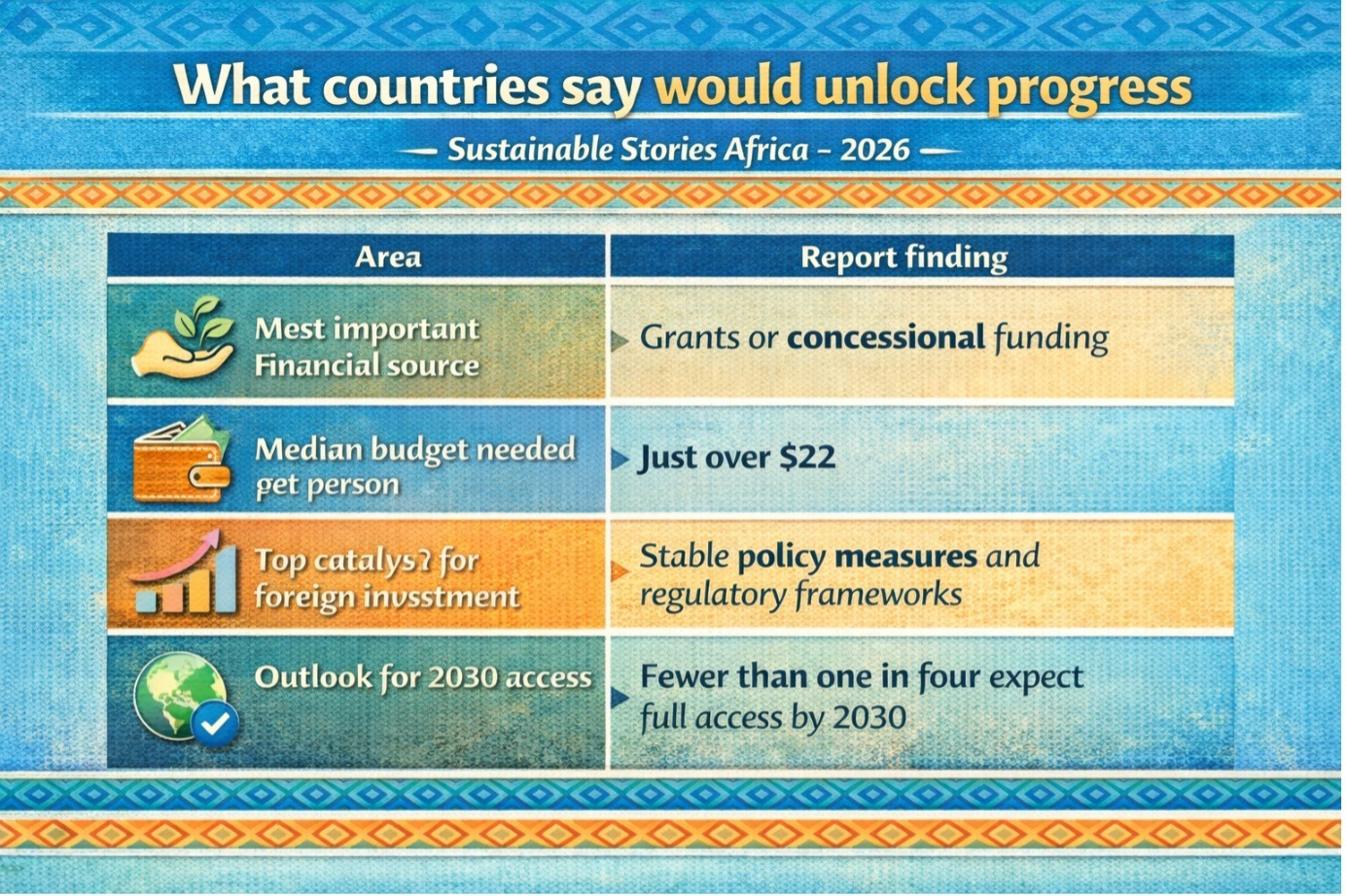 For African markets, the lesson is practical. Track money, reduce policy ambiguity, and use grants and concessional finance to pull in commercial capital.
