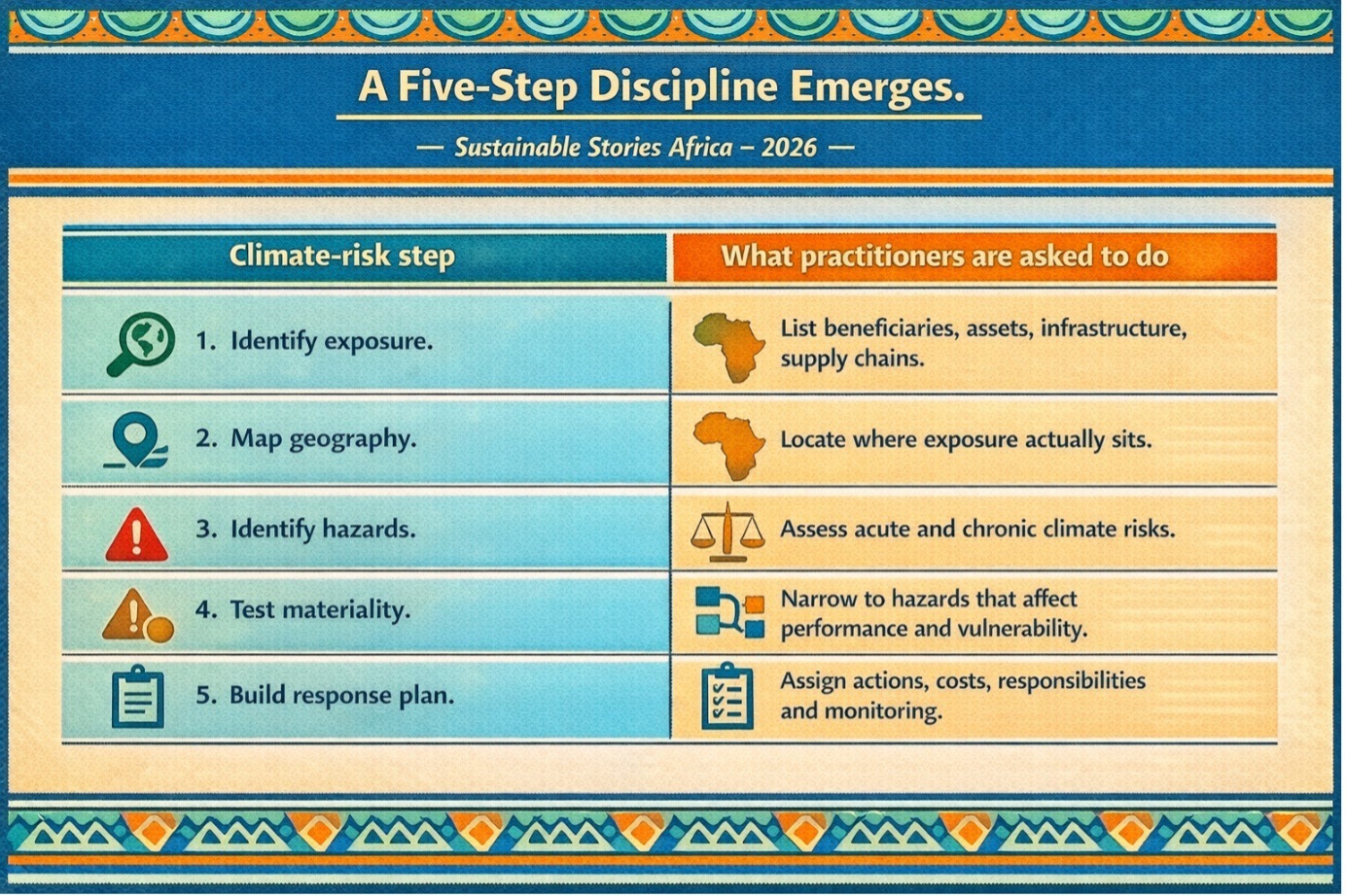 That sequence is more than technical housekeeping. It amounts to a new logic for climate finance: understand the hazard, explain how your intervention reduces vulnerability, then prove the result.