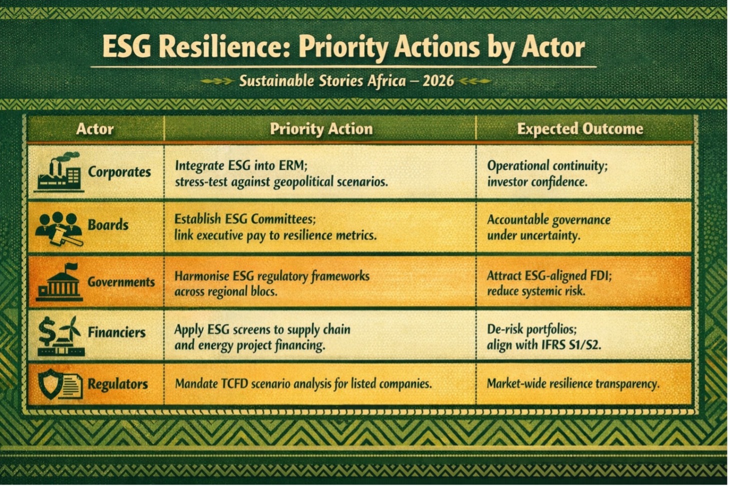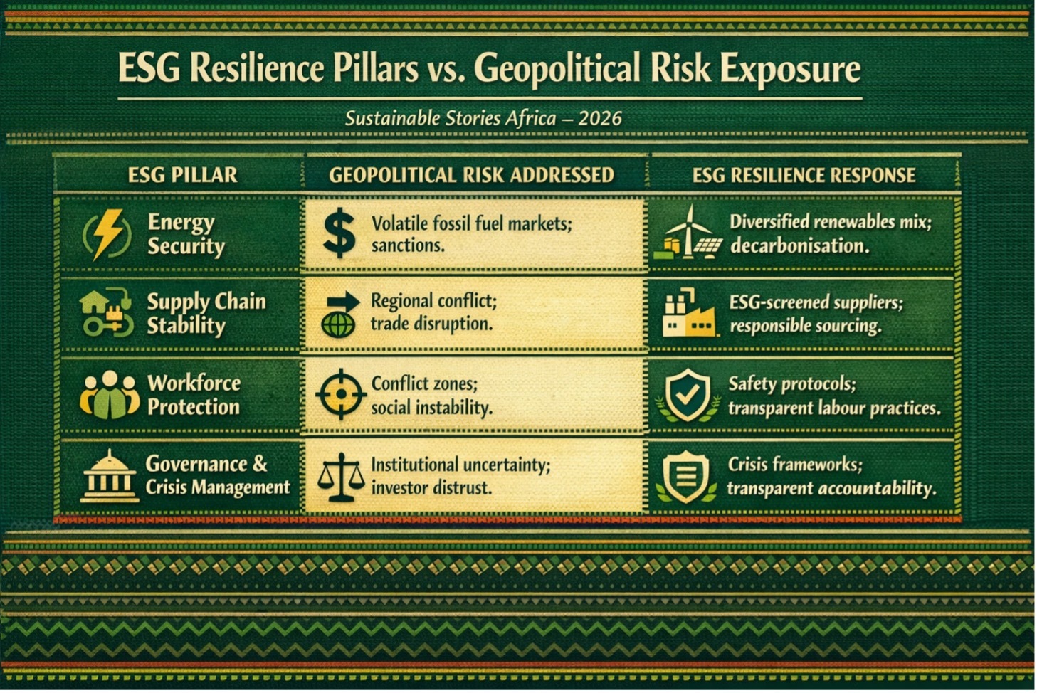 ESG is not a reporting burden; it is a strategic resilience system. The four pillars of energy security, supply chain stability, workforce protection, and governance form the operational architecture Africa's institutions need to absorb geopolitical shocks and convert disruption into competitive advantage.