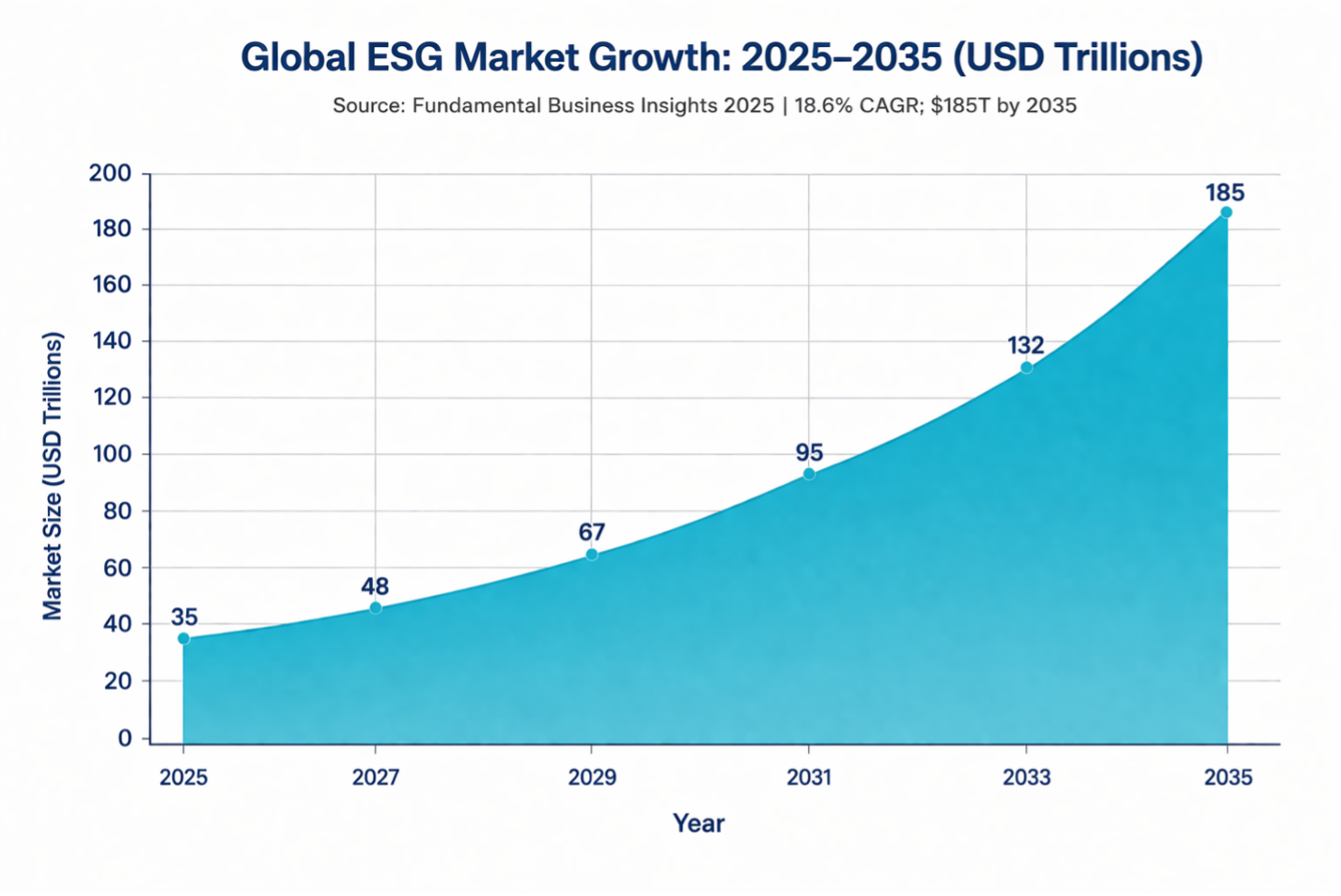 The global ESG investing market reached $33.67 trillion in 2025 and is projected to rise to $185.39 trillion by 2035, growing at a compound annual rate of 18.6%.