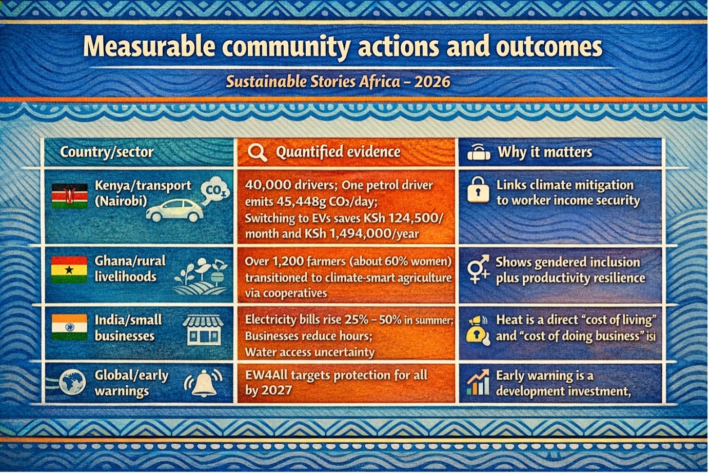 In Kenya, transport workers organising around electric mobility quantify both emissions and savings. In Ghana, climate-smart agriculture efforts show how resilience can stabilise food systems and incomes. In India, small business heat coping strategies underline why micro-insurance and cooling finance matter.