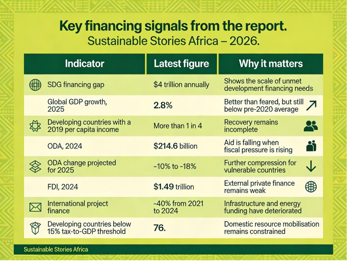 Add in falling official development assistance, weak investment flows and renewed trade strain, and the report’s core message becomes clear: the financing problem is no longer one issue. It is a system-wide constraint.