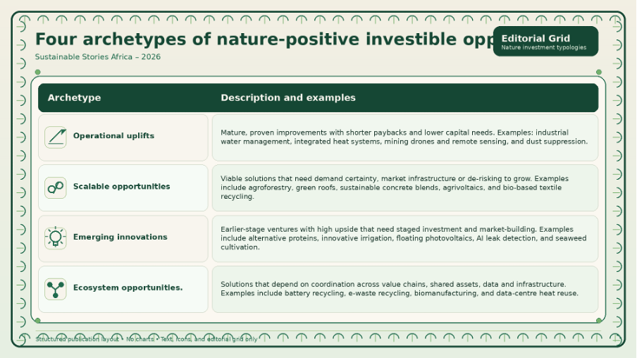 The commercial case is equally broad. Some openings create new revenue, others cut operating costs, and some reduce capital intensity. That breadth gives boards and financiers a clearer way to assess nature opportunities through familiar financial lenses.