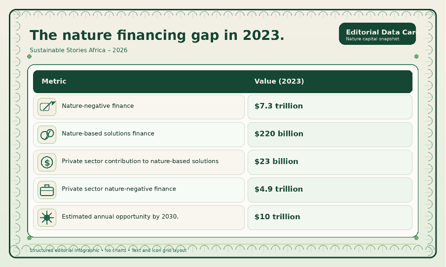 The deeper problem is capital allocation. In 2023, $7.3 trillion still flowed into nature-negative activities, while only $220 billion went into nature-based solutions.