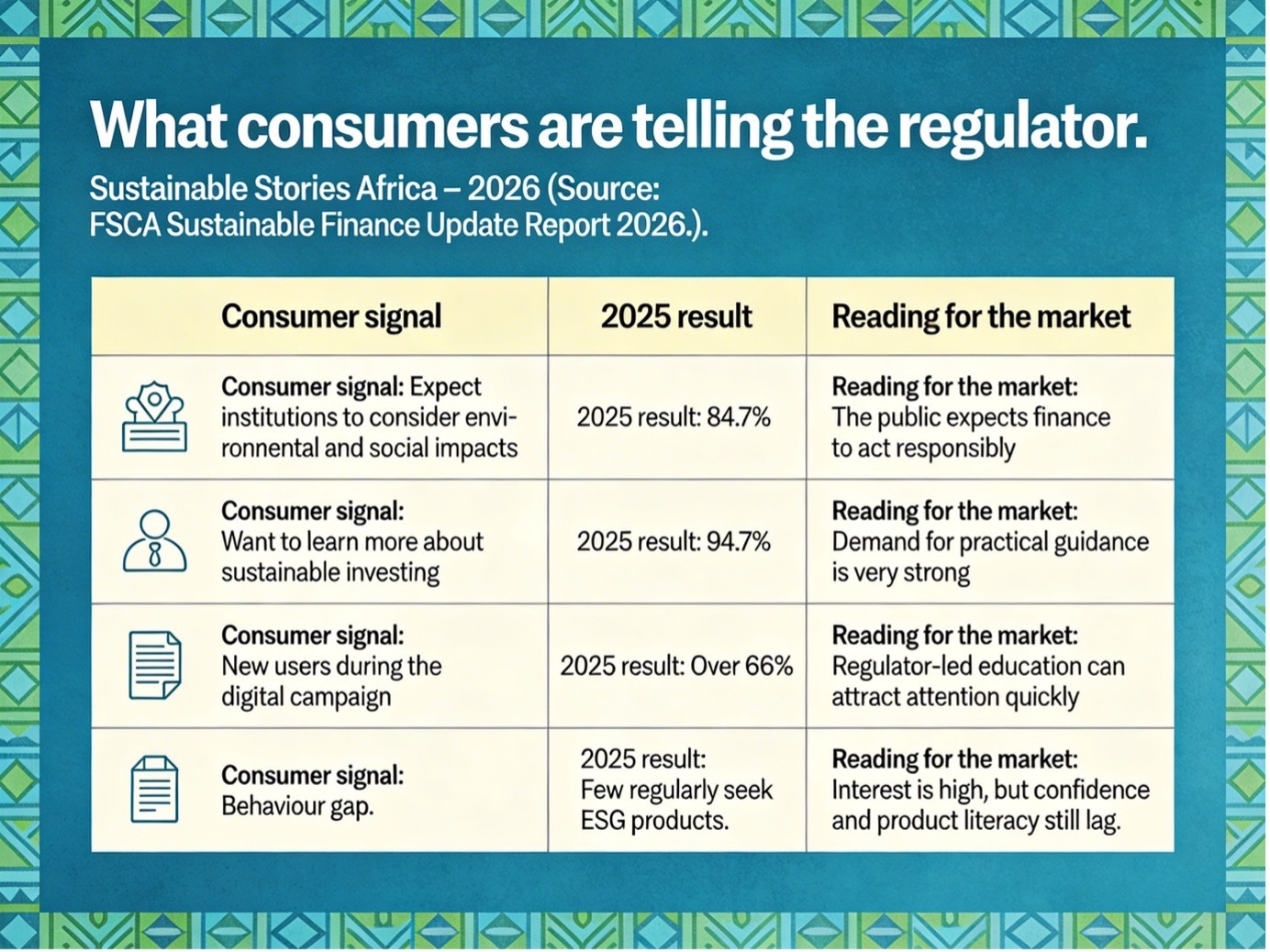 During the FSCA’s March 2025 digital awareness campaign, new users on its consumer education platform jumped 66% week-on-week, while survey results show 84.7% of respondents want financial institutions to consider environmental and social impacts, and 94.7% want to learn how investments can help society and the environment.