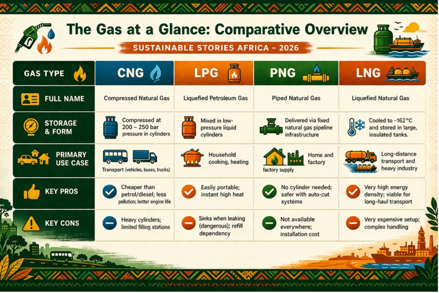 The continent produced 331 billion cubic metres of natural gas in 2025, led by Algeria, Nigeria, and Egypt; however, it still imports fuels, leans on diesel, and depends heavily on biomass. Distinguishing CNG, LPG, PNG, and LNG matters.