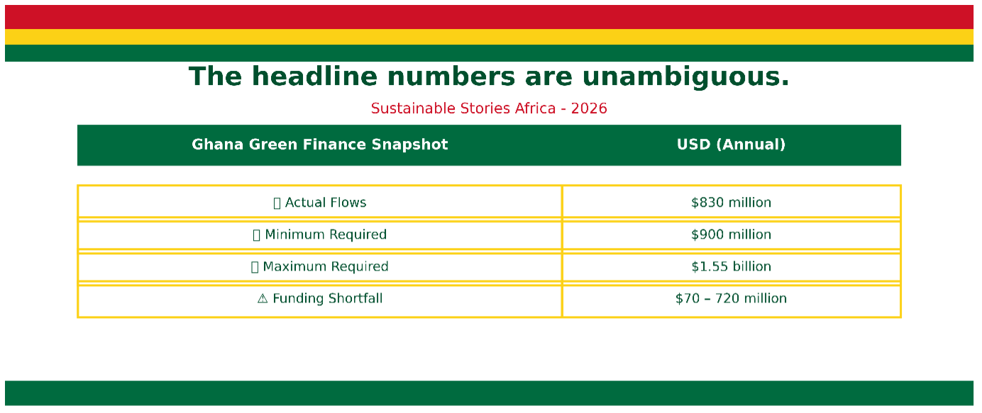 Ghana requires between $900 million and $1.55 billion annually to meet its climate targets. However, the actual green finance flows stand at roughly $830 million, leaving a funding gap of up to $720 million.