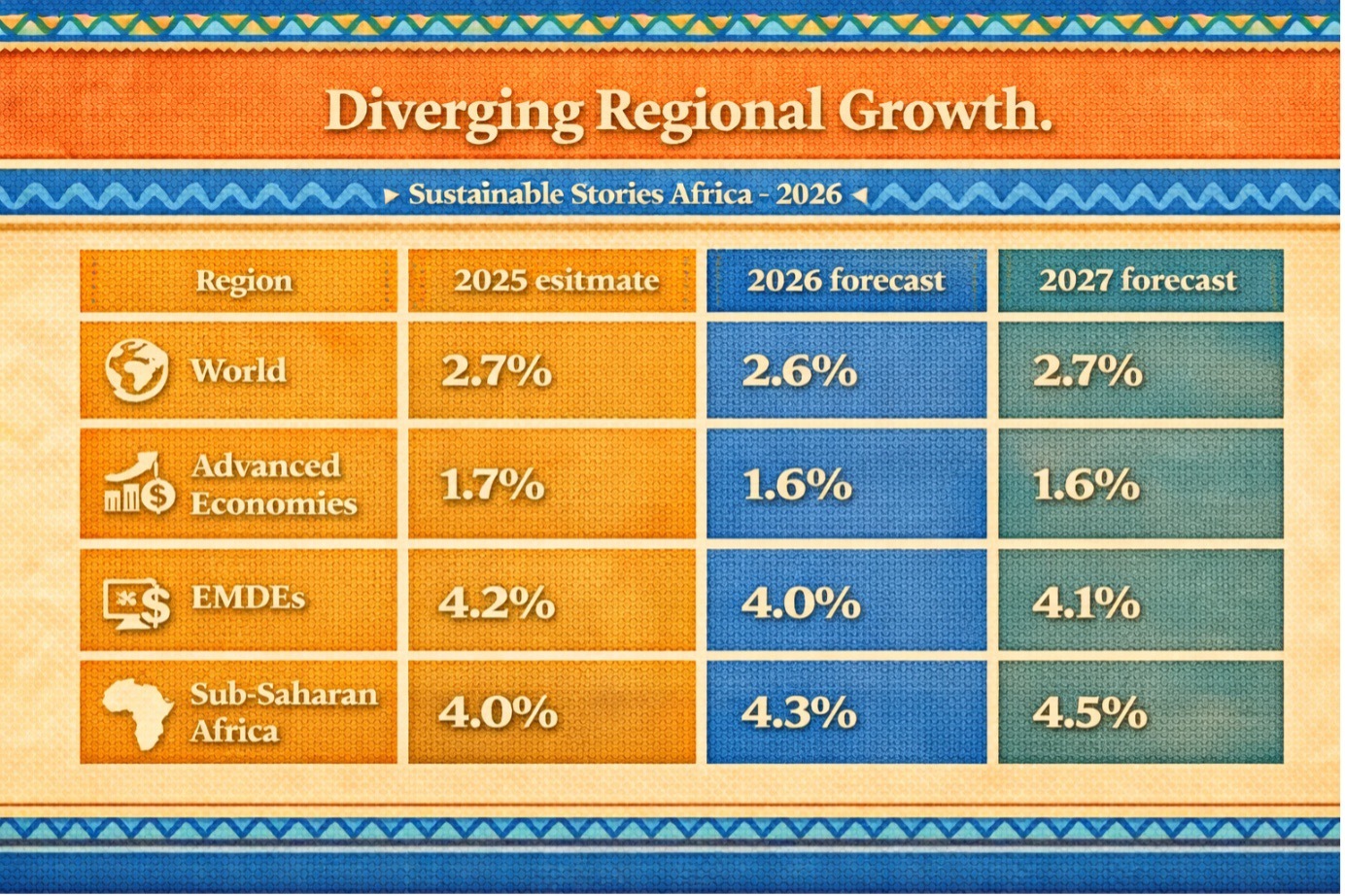 Sub-Saharan Africa is projected to grow modestly by 4.3% in 2026 and 4.5% in 2027; however, this remains below levels needed to accelerate poverty reduction.