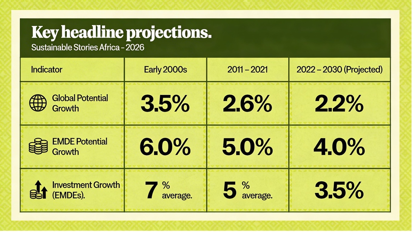 The global economy is entering what the World Bank describes as a prolonged period of structural weakness, not merely a cyclical slowdown. According to Falling Long-Term Growth Prospects: Trends, Expectations, and Policies (Part II of the report, pp. 225–388), potential global GDP growth, the maximum sustainable rate an economy can maintain without igniting inflation, is projected to decline to 2.2% annually through 2030, the lowest in three decades.