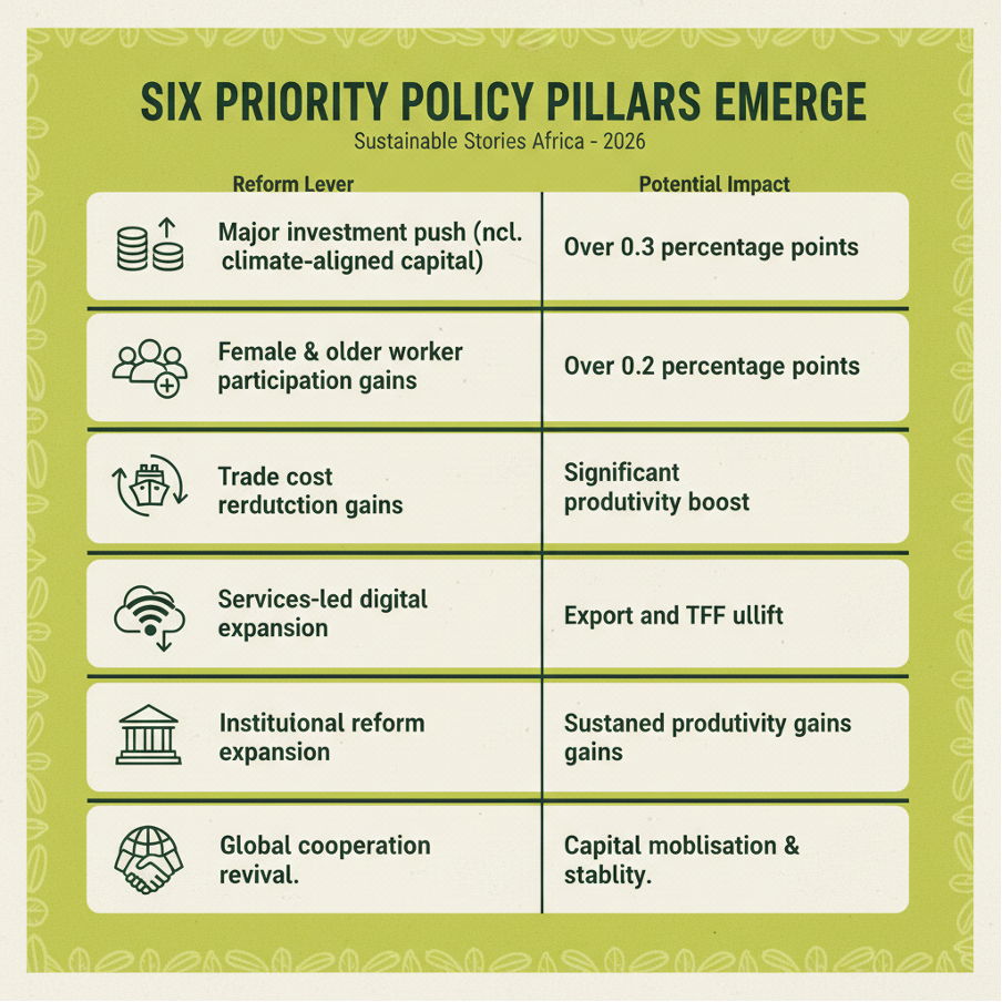 The report is not fatalistic. It models an upside scenario: if countries replicate their strongest reform episodes of the past decade, global potential growth could increase by 0.7 percentage points, lifting it to 2.9% annually.
