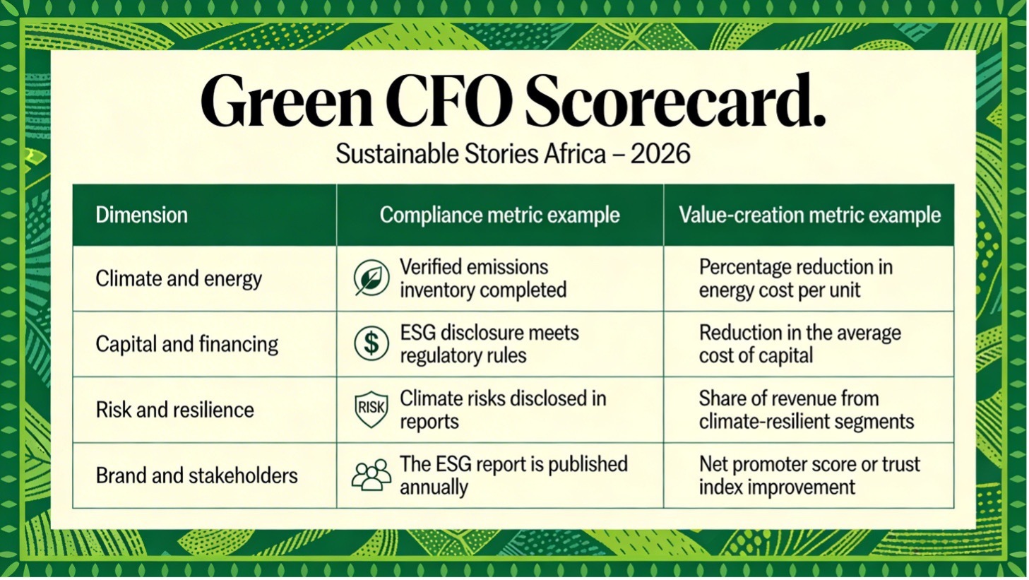 A simple way to track progress is to build a “Green CFO Scorecard” that pairs compliance indicators with value-creation metrics: