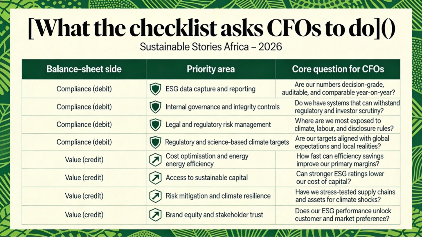 The “Green CFO Checklist” popularised by global sustainability expert Dr Edward Mungai reframes the mindset, putting value creation and risk management at the heart of ESG decisions.