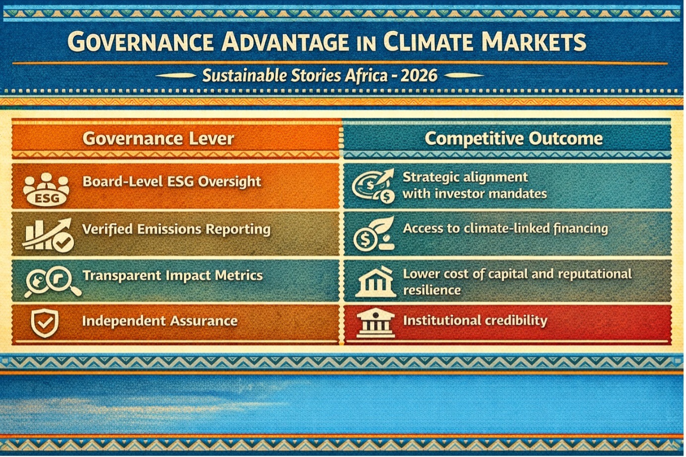 In African markets, where climate vulnerability intersects with infrastructure deficits, credible ESG positioning could unlock blended finance, green bonds, sustainability-linked loans and transition capital.