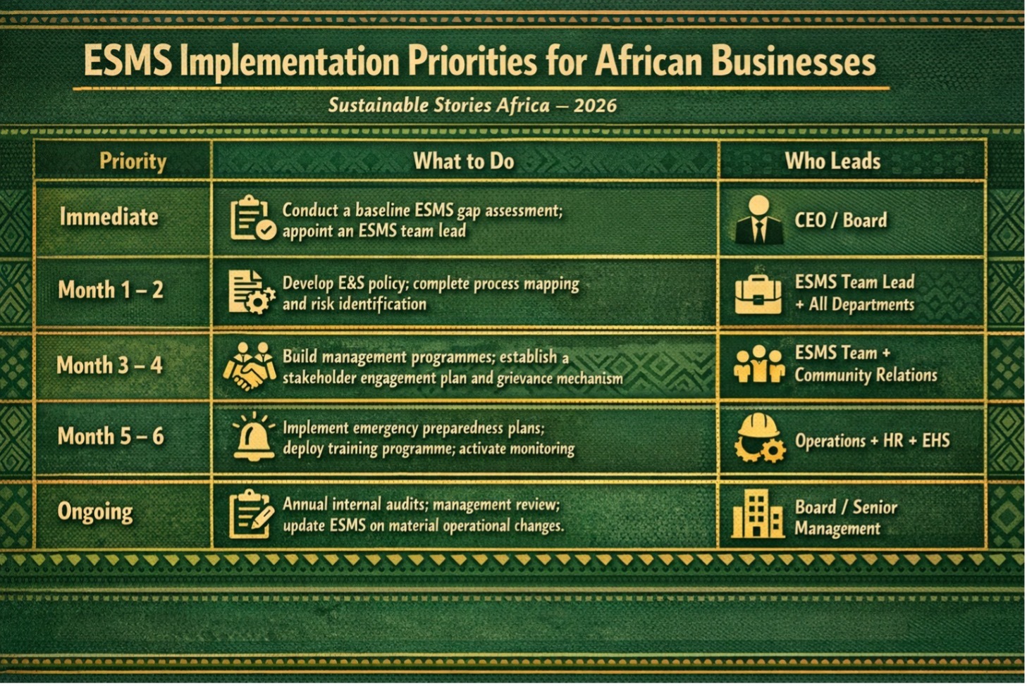 | Immediate | Conduct a baseline ESMS gap assessment; appoint an ESMS team lead | CEO/Board |