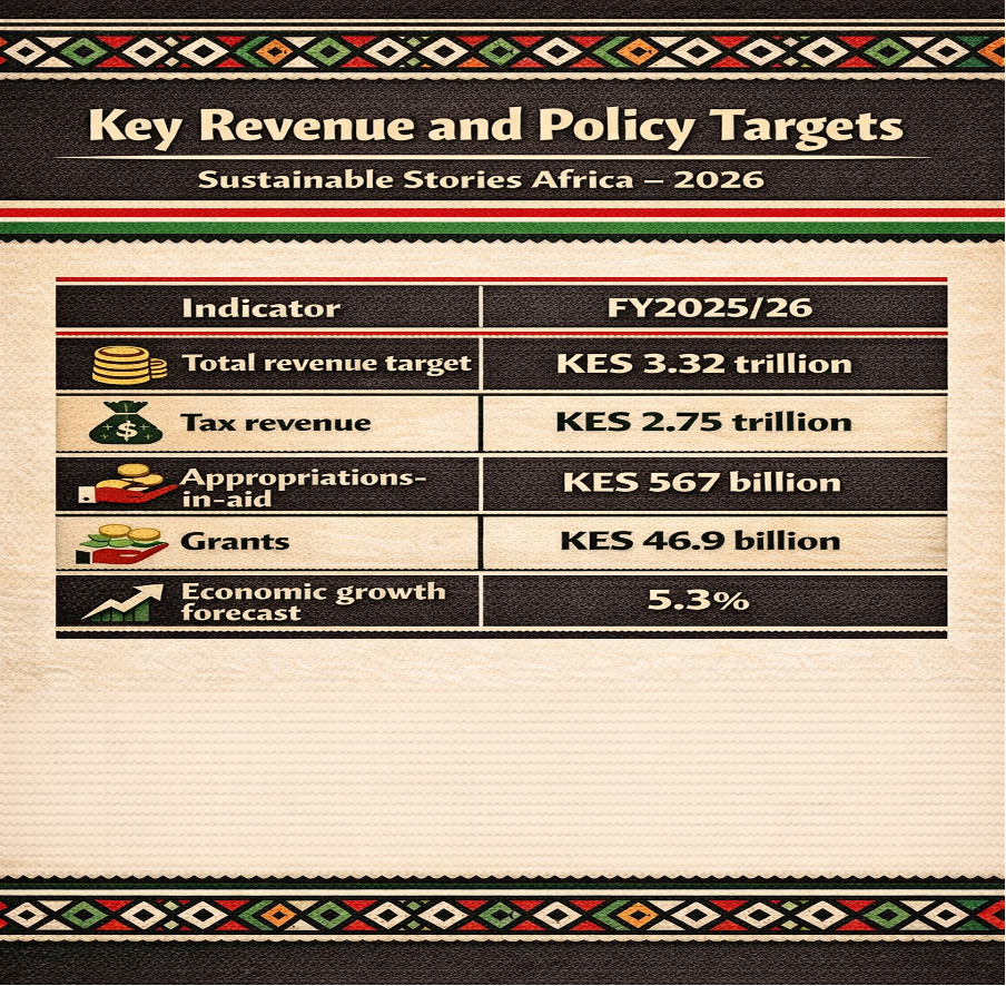 The Act targets KES 3.32 trillion in revenue for FY2025/26, anchored by KES 2.75 trillion in tax revenues, alongside appropriations-in-aid and grants.