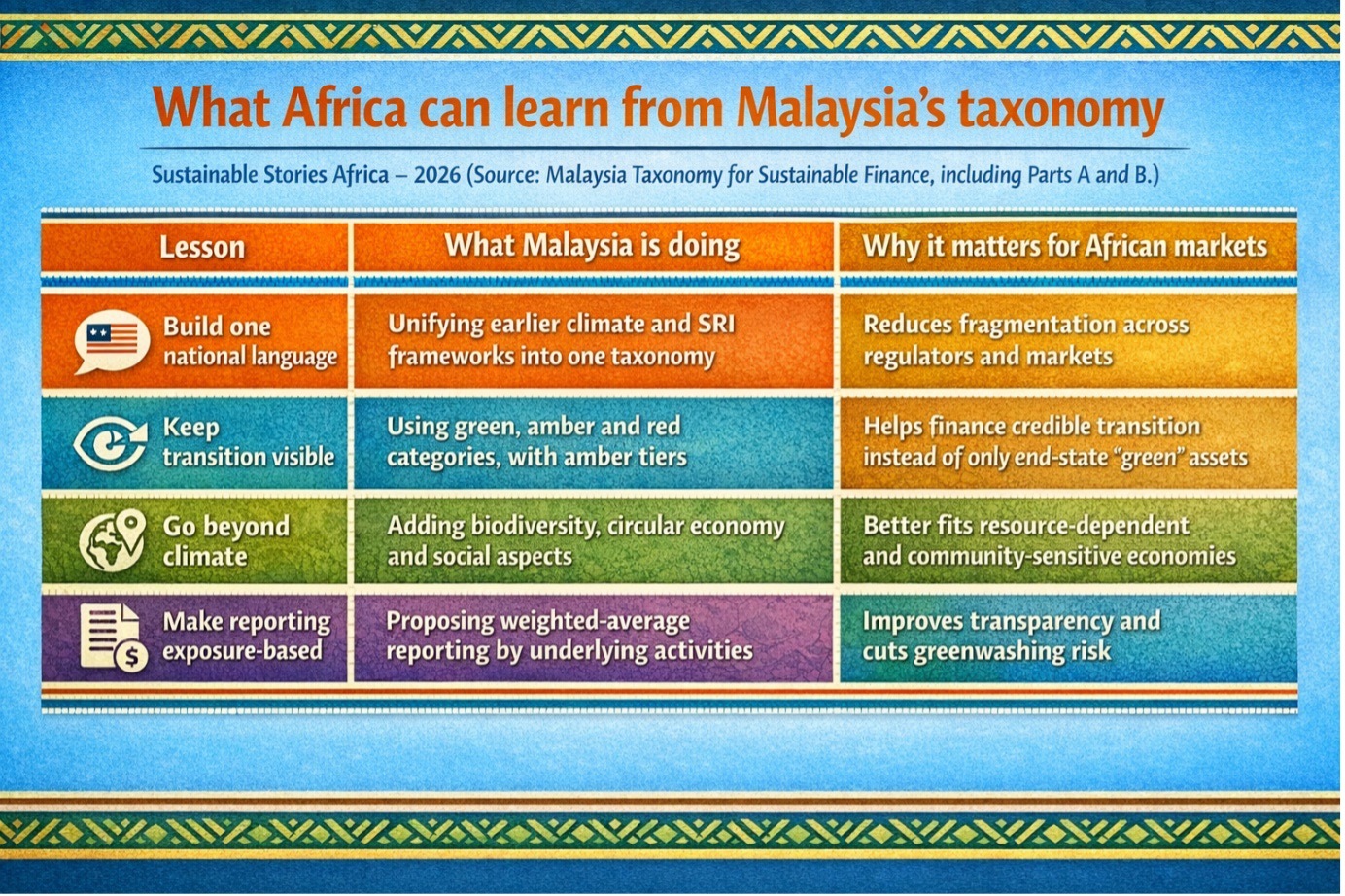 - The second lesson is about transition honesty – Malaysia's taxonomy retains the ASEAN green, amber, and red architecture, including amber tiers that recognise transitional progress rather than treating every non-green activity as an automatic failure. African markets with carbon-intensive but economically critical sectors need exactly that structured nuance.