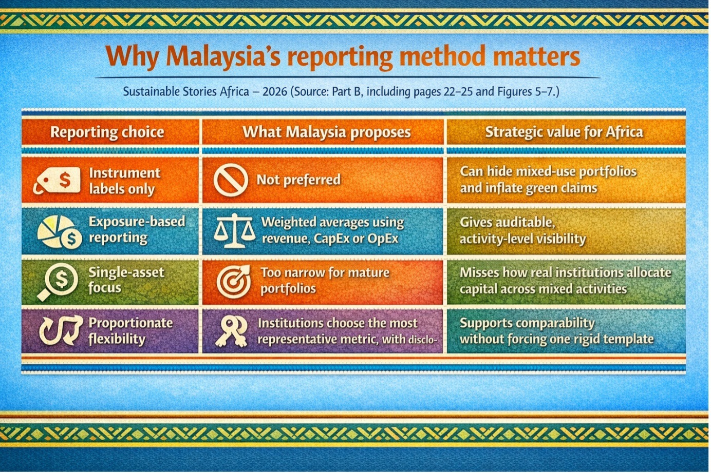 - The fourth lesson is pragmatism – A taxonomy that ignores data constraints, SME capabilities, and mixed portfolios will not function in practice. Malaysia's consultation process, such as addressing phased implementation, reporting feasibility, and proportional support, treats pragmatism as a design principle, rather than a design weakness. Africa must do the same.