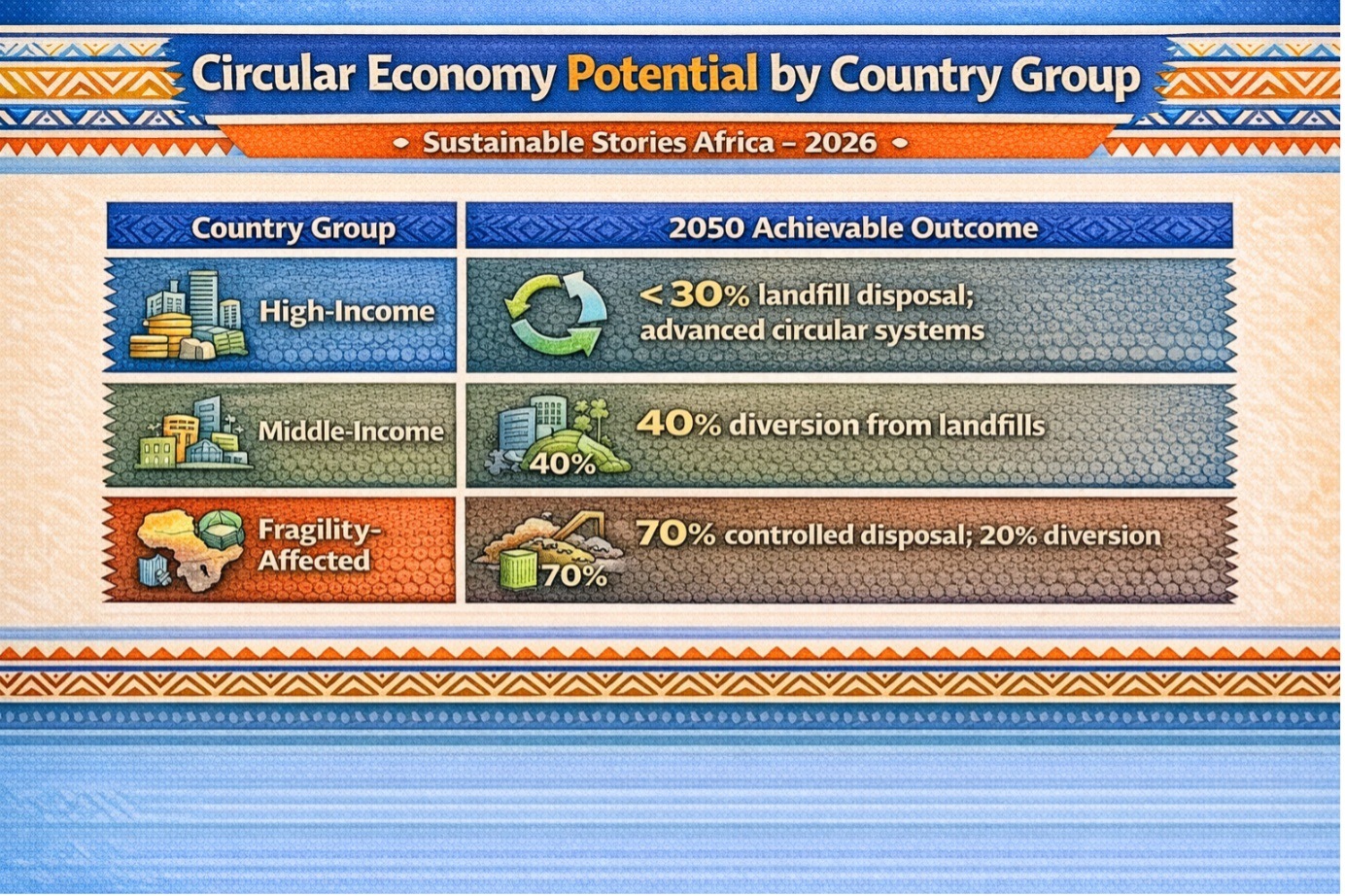 Conflict-affected economies could prioritise universal collection and basic controlled disposal, achieving 70% controlled disposal rates by 2050.