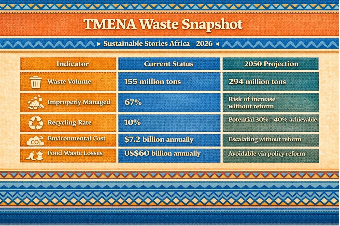 The consequences are measurable. Environmental damage from mismanaged waste costs the region an estimated $7.2 billion annually, equivalent to losing the GDP of Jordan or Tunisia every six years. Marine pollution alone increased by up to 2% of GDP in some countries.