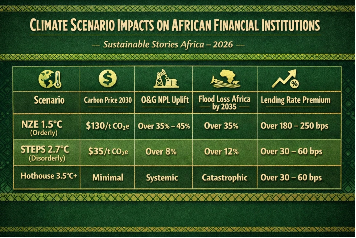 | Scenario | Carbon Price 2030 | O&G NPL Uplift | Flood Loss Africa by 2035 | Lending Rate Premium |