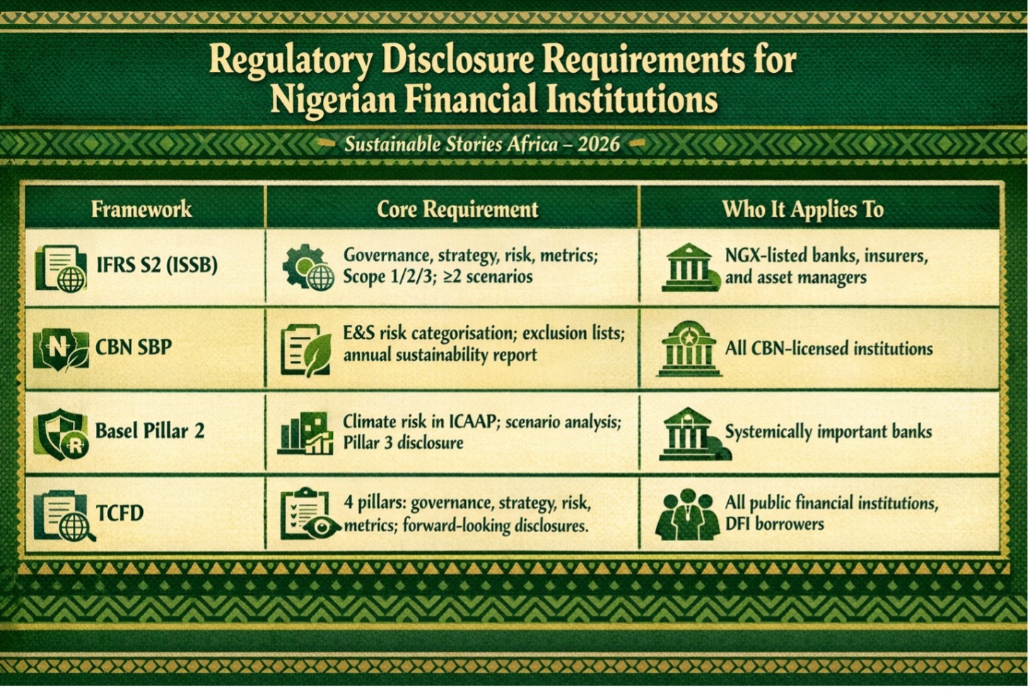 | IFRS S2 (ISSB) | Governance, strategy, risk, metrics; Scope 1/2/3; ≥2 scenarios | NGX-listed banks, insurers, and asset managers |