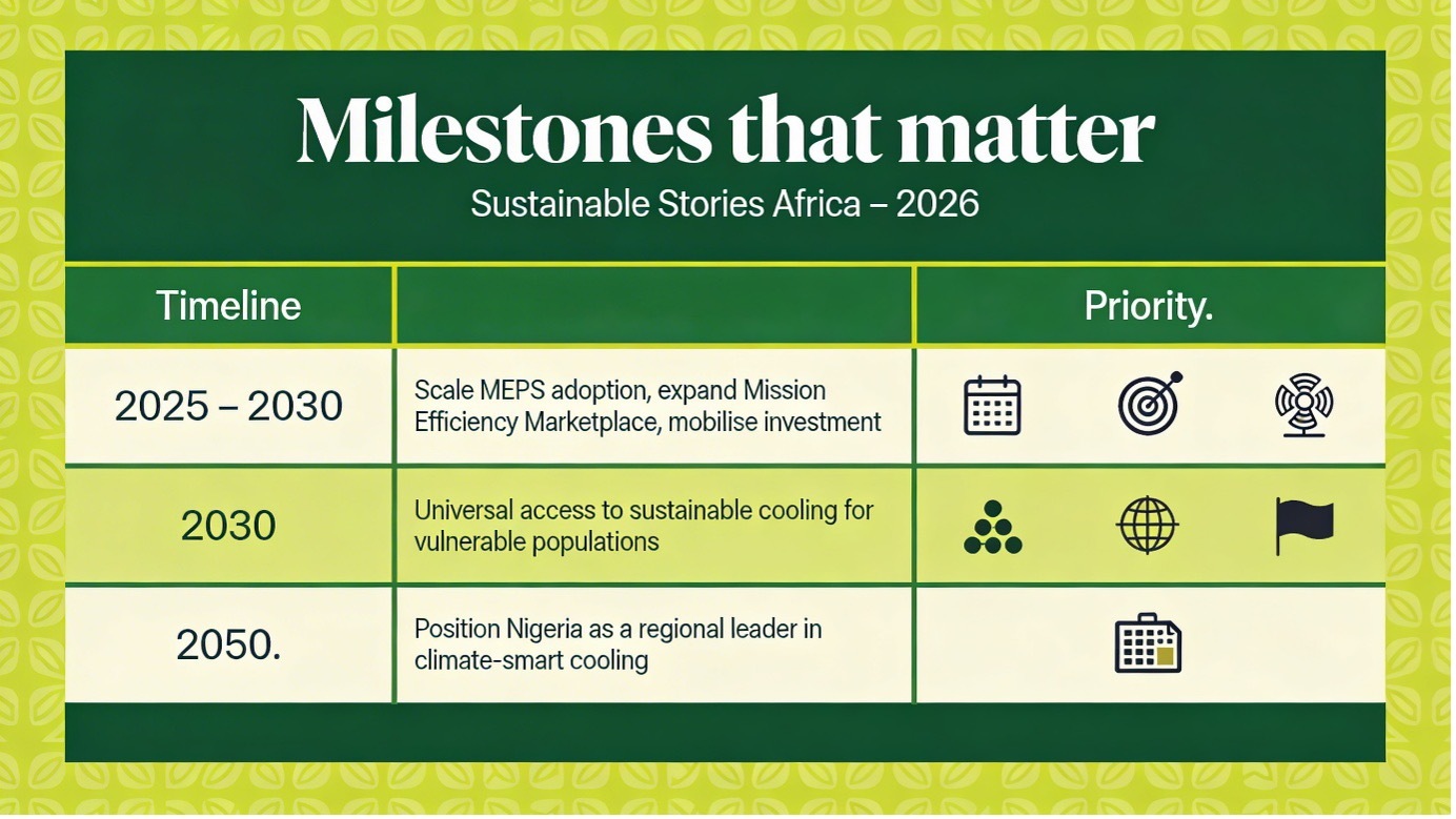 The timeline in the review is useful here. On page 7, it sets out a 2025 – 2030 period for scaling MEPS, expanding the Mission Efficiency Marketplace and mobilising investment; a 2030 goal of universal access to sustainable cooling for vulnerable populations; and a 2050 vision of Nigeria as a regional leader in climate-smart cooling with a resilient energy system and thriving green economy.