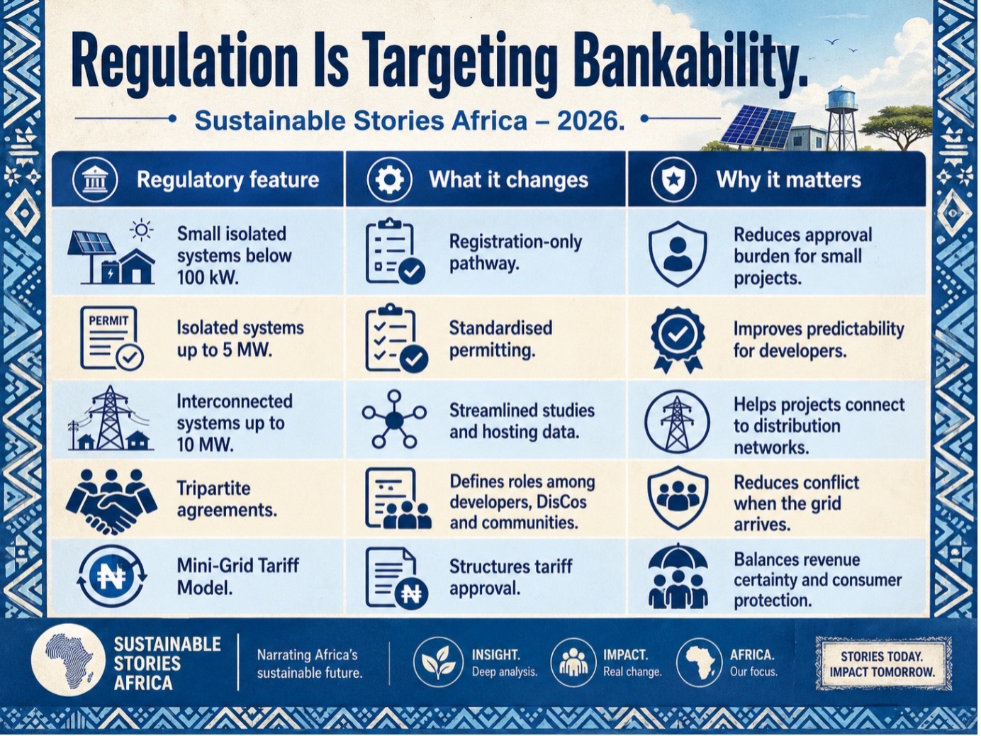 The updated 2026 framework, according to the regulatory insight note, is intended to accelerate private-sector participation by clearly classifying isolated and interconnected mini-grids, simplifying registration and permitting, and providing structured pathways for interconnection and future grid arrival.