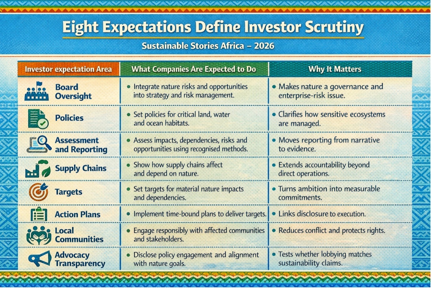 For African companies, the signal is direct: biodiversity, water stress, deforestation, pollution and community consent are becoming investor-facing business issues, not optional ESG language.