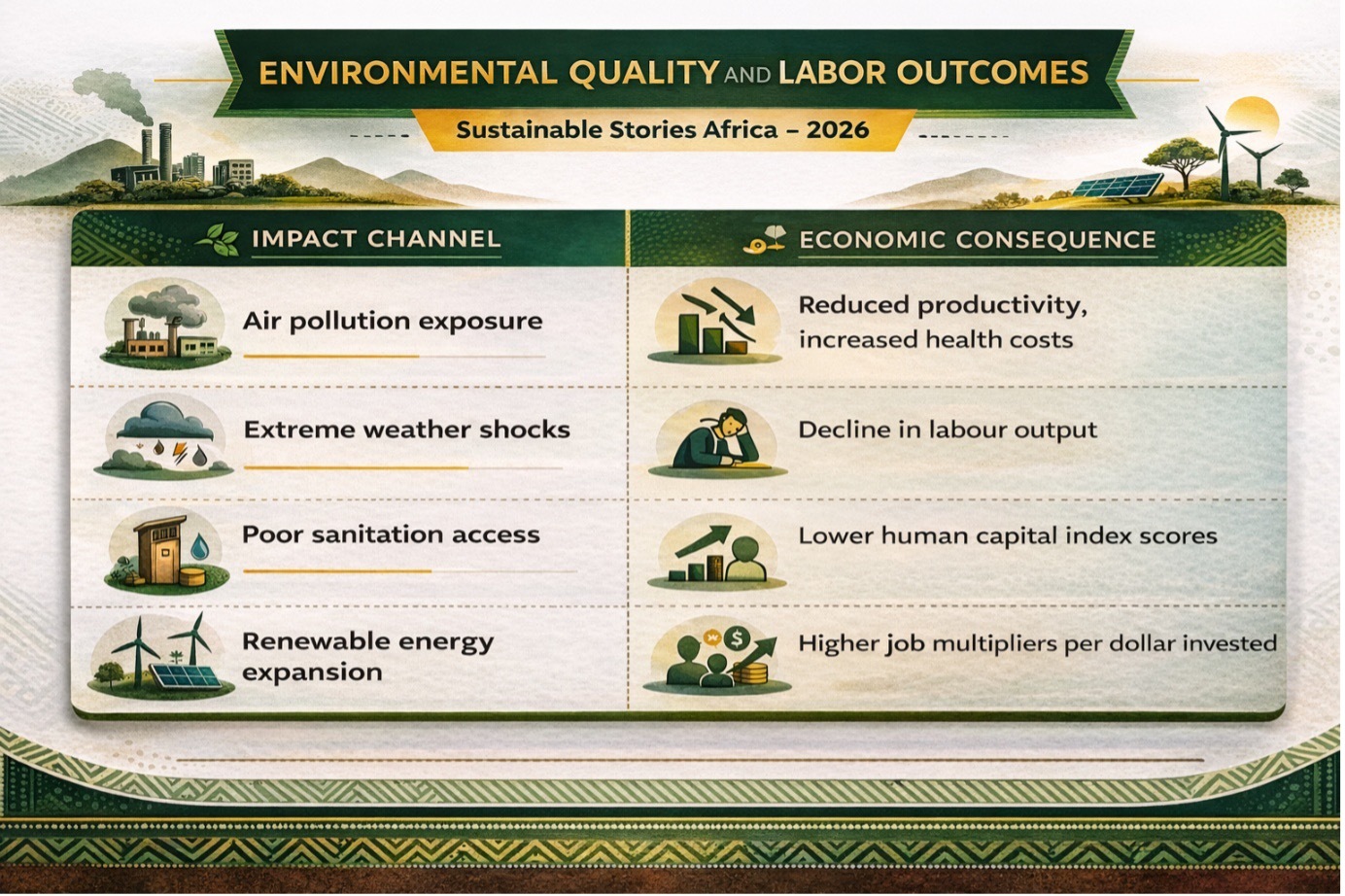 Environmental degradation is shown to directly reduce labour productivity. Extreme weather events lower output. Air pollution increases sick days and cognitive impairment. Poor sanitation correlates with weaker human capital outcomes.