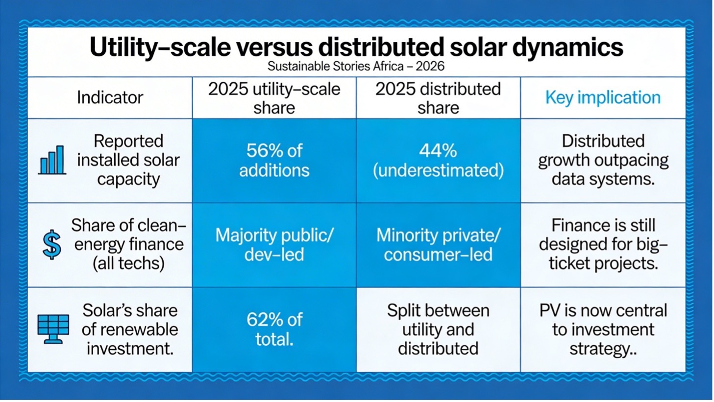 Behind the numbers, governments and DFIs are still backing big grid-connected parks, while households, SMEs and industry are moving to rooftop and captive systems to escape unreliable grids and fuel price shocks, creating a two-track transition that is quietly rewriting risk, returns and responsibility