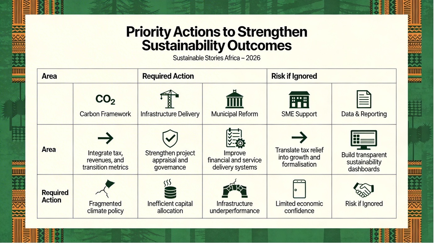 South Africa’s sustainability strategy now hinges on delivery, rather than design. Fiscal discipline, infrastructure investment, and social protection must translate into measurable outcomes, backed by transparent governance and data systems.