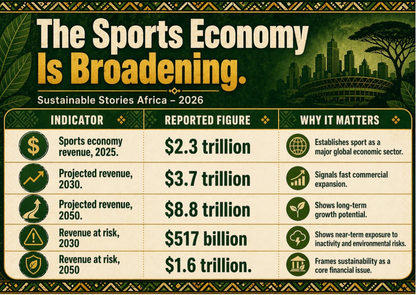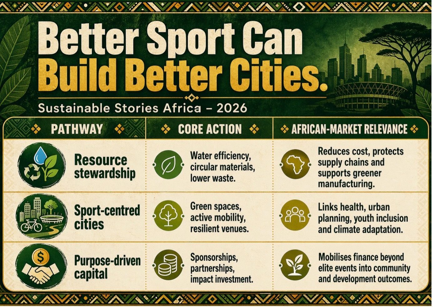 Africa should treat sport as climate-smart social infrastructure: a platform for health, jobs, tourism, inclusion and city resilience.
