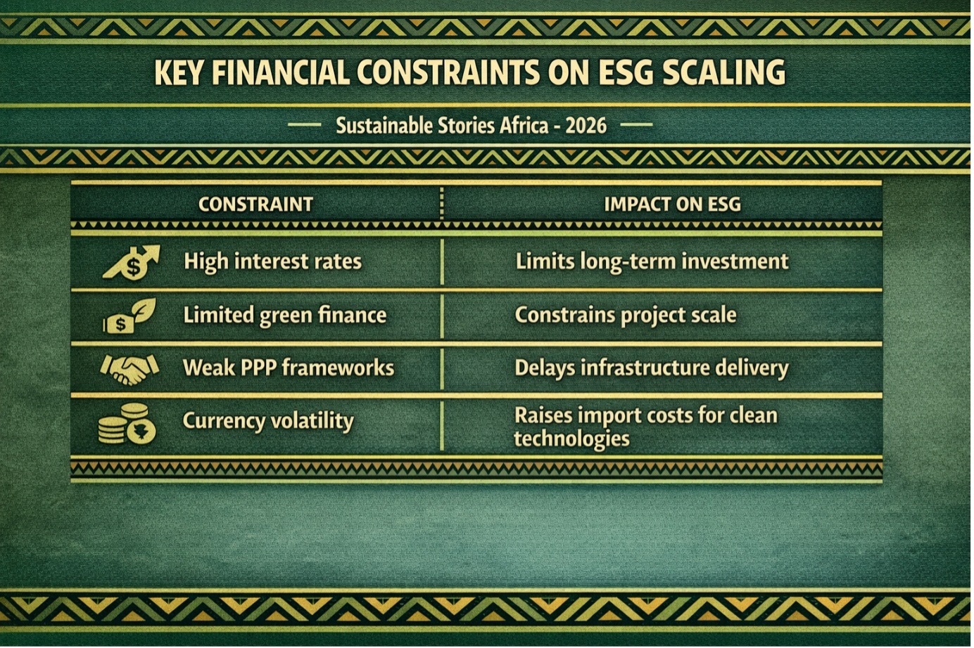 While ESG initiatives exist across energy, agriculture, waste, and infrastructure, their scale is constrained by high borrowing costs, weak institutional support, and limited access to long-term capital. The result is an ESG ecosystem rich in pilots, but poor in replication.