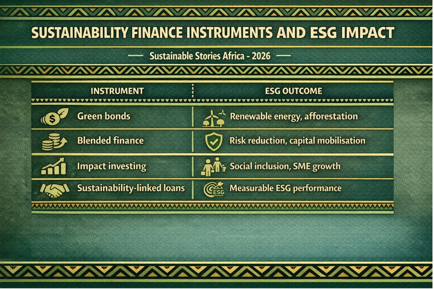 Sustainability finance addresses ESG's core mismatch: long-term impact versus short-term capital. Instruments such as green bonds, sustainability-linked loans, blended finance, and impact investing align financial incentives with environmental and social outcomes.