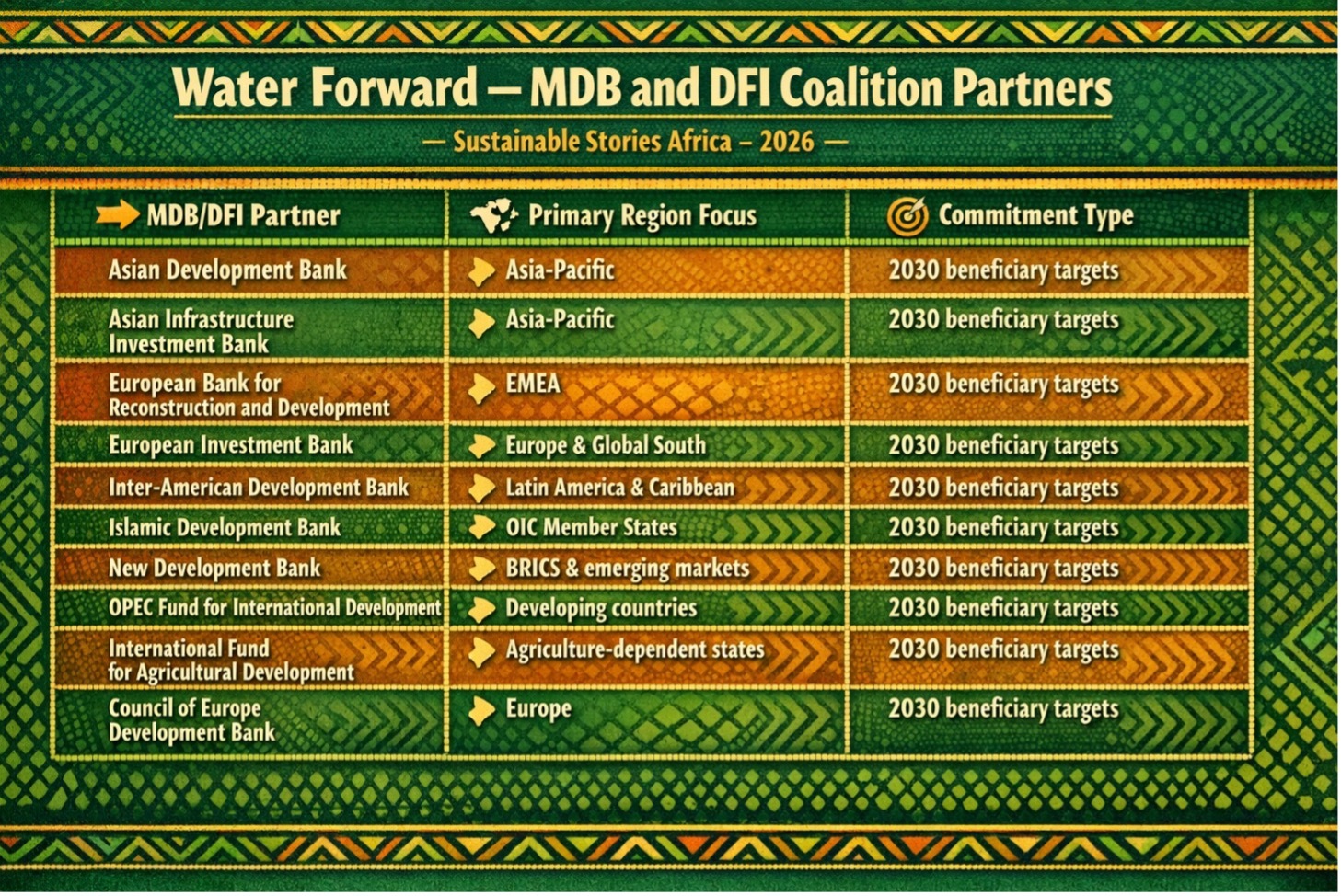 The initiative has drawn a broad coalition of multilateral development banks and development finance institutions, each setting 2030 beneficiary targets.
