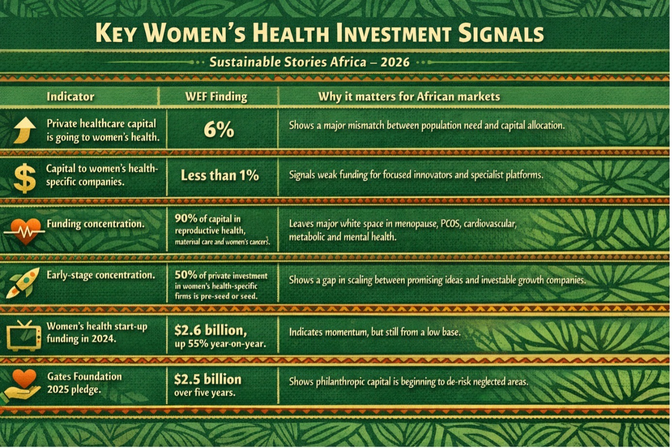 - For African governments, this means investing in sex-disaggregated health data, maternal and reproductive health infrastructure, national cancer screening systems, digital health regulation and reimbursement pathways that make women’s health ventures bankable.