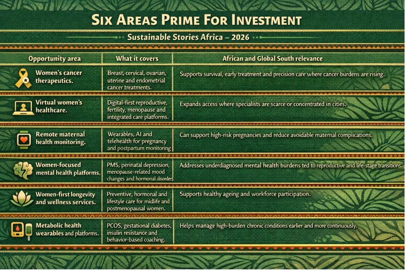 In African markets, the same logic could apply to maternal monitoring, cervical cancer screening, fertility support, menopause care, digital women’s health platforms and women-focused mental health services.