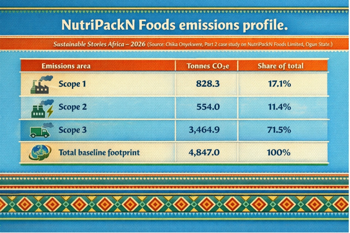 Its Ogun State case study, NutriPackN Foods Limited, shows a food processor with a baseline footprint of 4,847 tonnes CO₂e per year, a 30% reduction target by 2028, required investment of N58.5 million, annual cost savings of N42.8 million and a payback period of just 1.4 years.